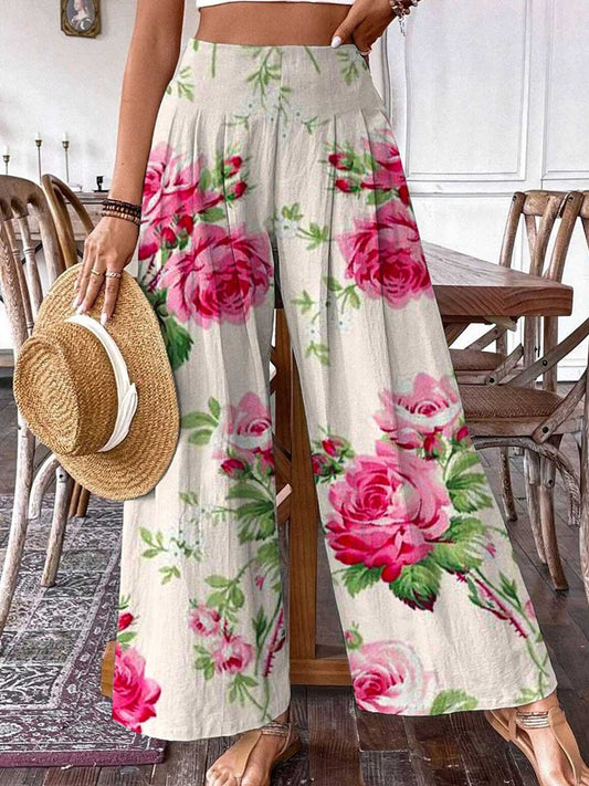 Women's Rose Floral Pattern Cotton Wide Leg Pants
