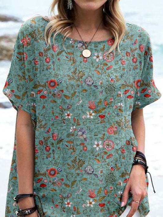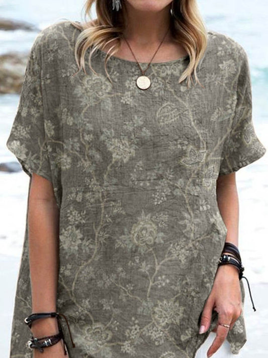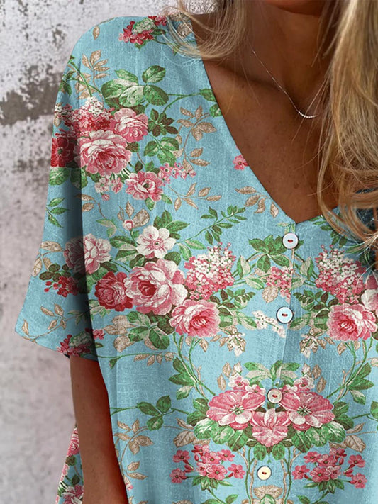 Women's Elegant Simple Decorative Floral Print Cotton And Linen Top