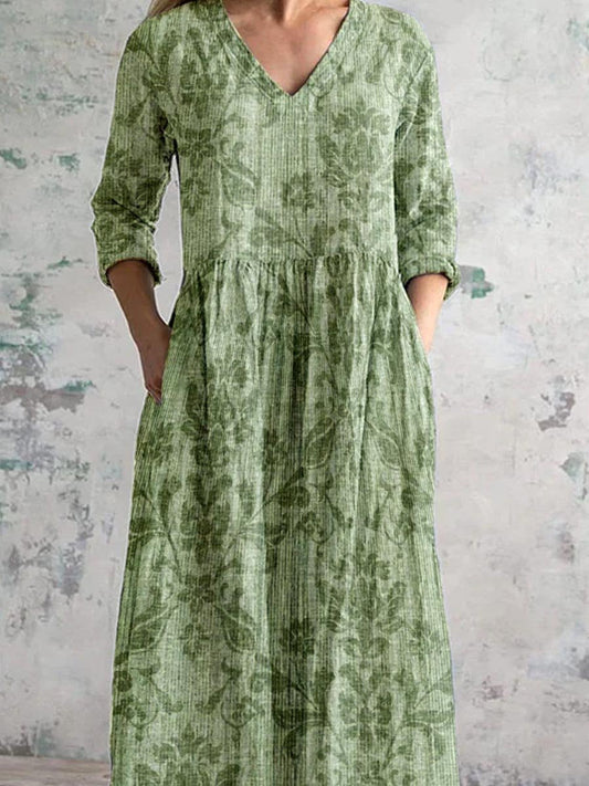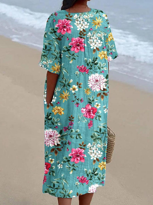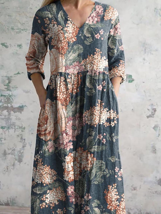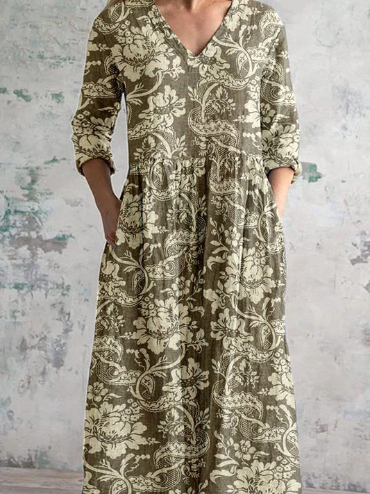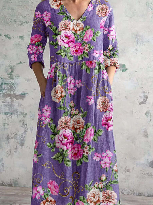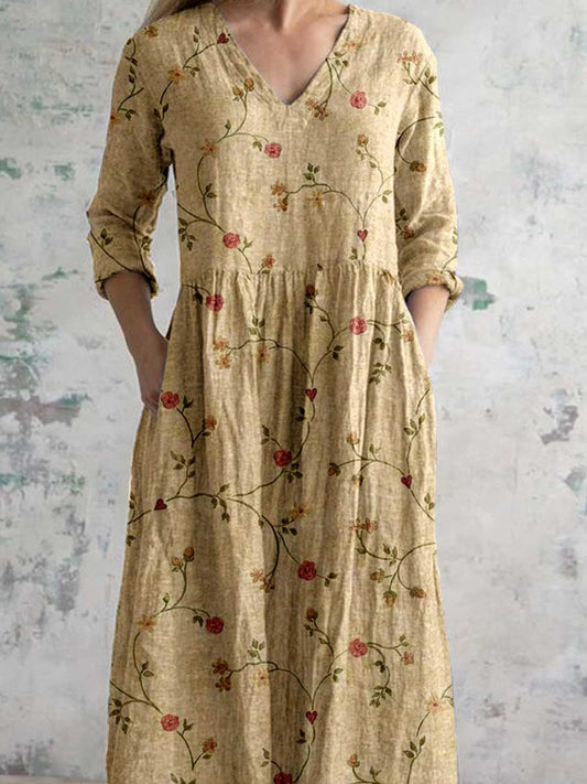 Women's Elegant Vintage Floral V-Neck Cotton and Linen Dress with Pockets