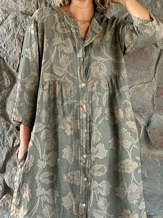 Women's Elegant Simple Shirt Style Cotton and Linen Dress with Decorative Floral Print