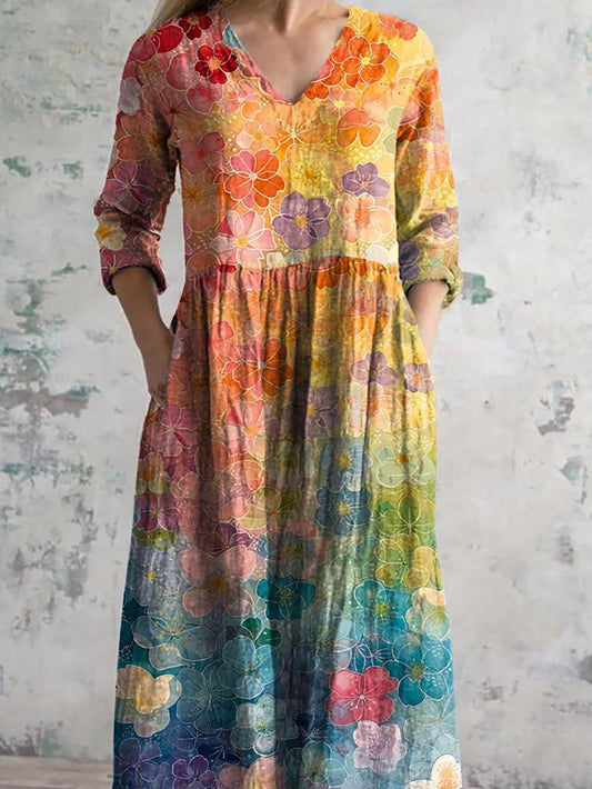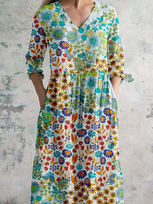 Women's V-neck Elegant Simple Floral Pattern Cotton And Linen Dress With Pockets