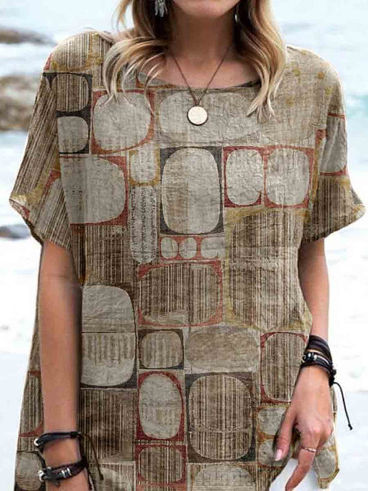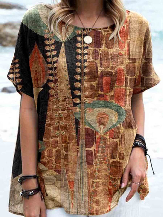 Women's Retro Art Geometric Pattern Printed Linen Top