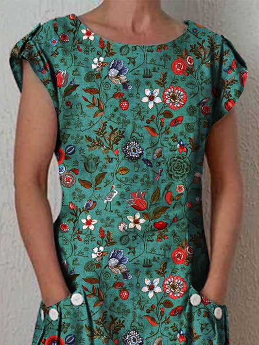 Women's Elegant Simple Embellished Floral Print V-Neck Cotton and Linen Dress with Pockets