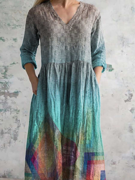 Women's V-Neck Colorful Geometric Ombre Pattern Dress With Pockets