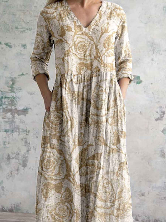 Women's Resort Style Rose Pattern Cotton and Linen V-Neck Dress