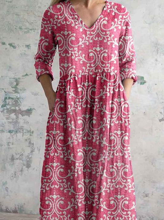 Women's V-Neck Bohemian Pattern Cotton and Linen Pocket Dress