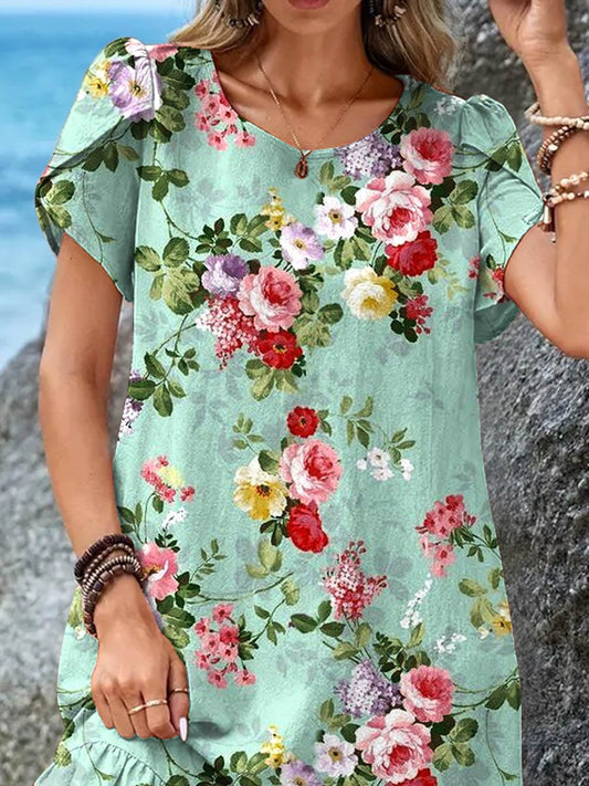 Women's Floral Art Print Crew Neck Casual Petal Sleeve Ruffle Hem Dress