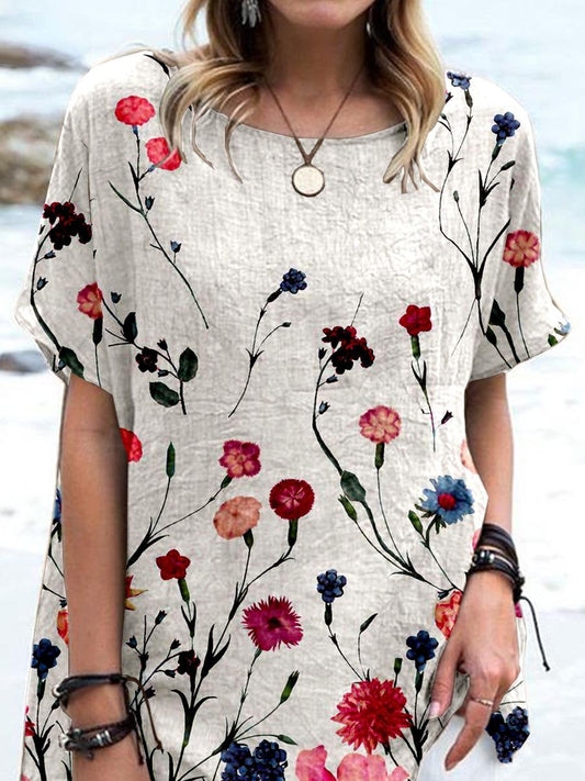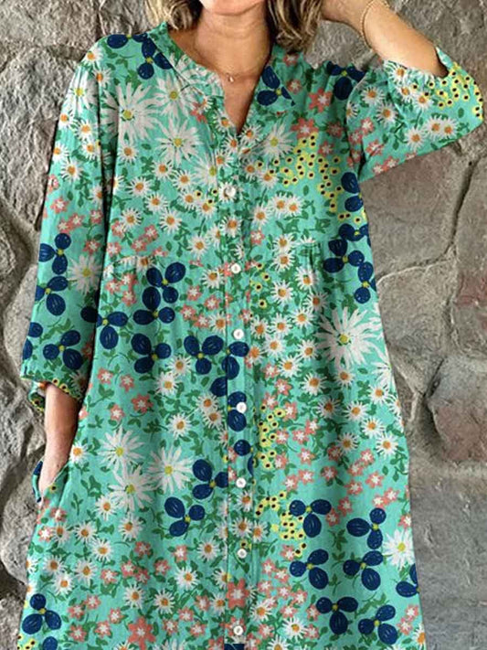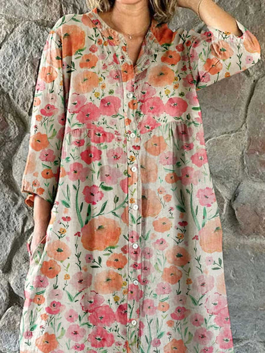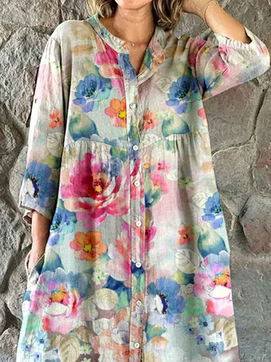 Women's Elegant Simple Floral Pattern Shirt Cotton and Linen Dress with Pockets