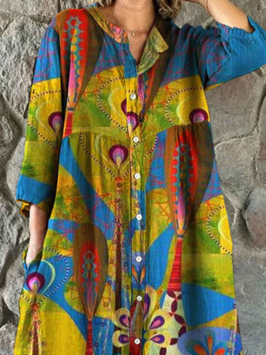 Women's Retro Art Geometric Split Color Pattern Shirt Style Cotton and Linen Dress