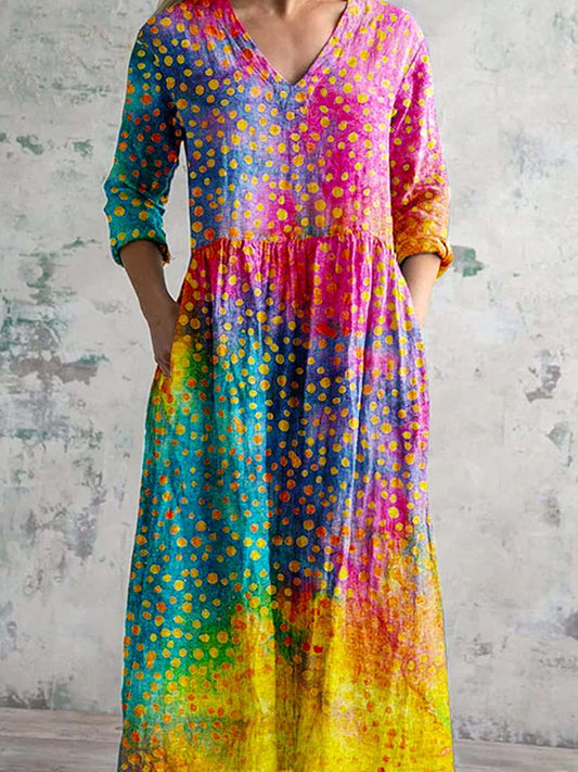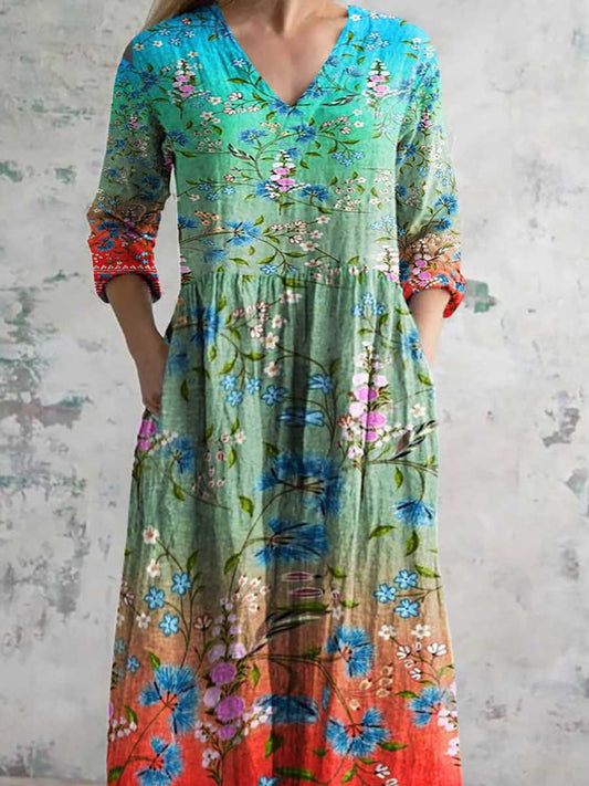 Women's Art Rainbow Floral Print V-Neck Cotton and Linen Dress