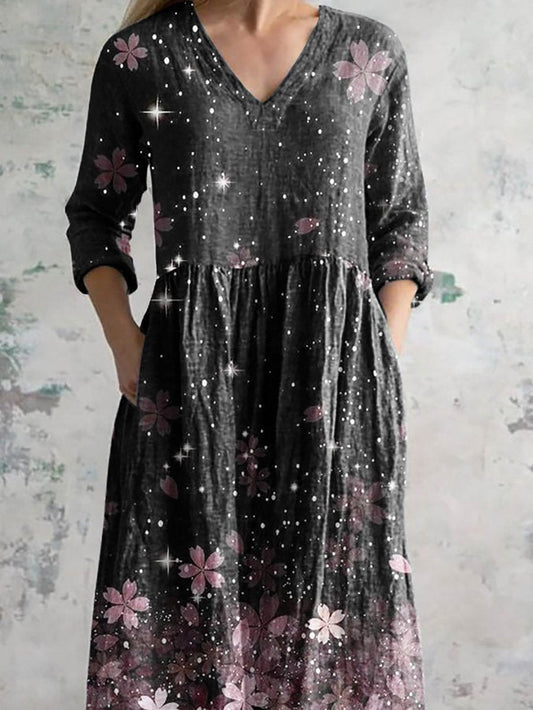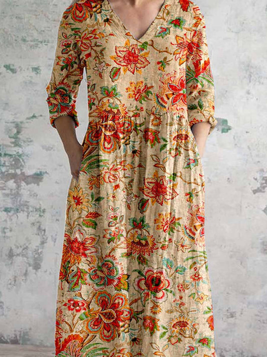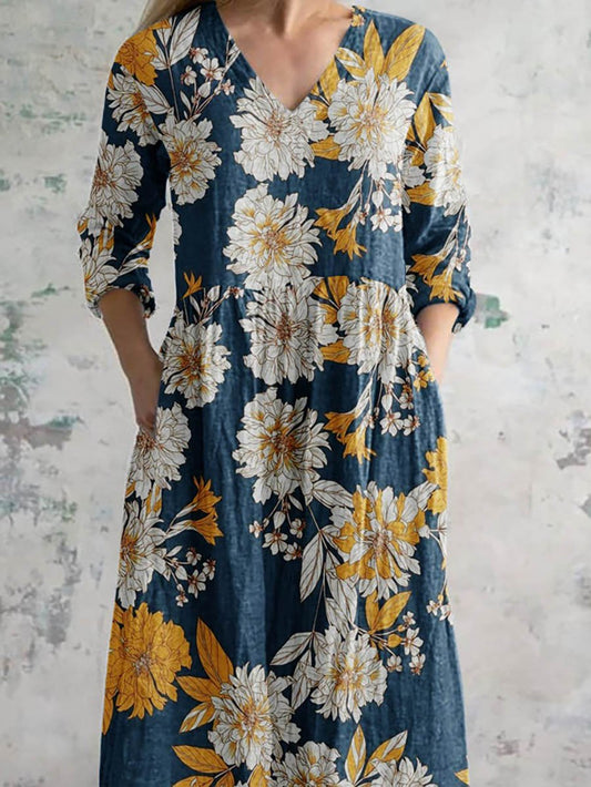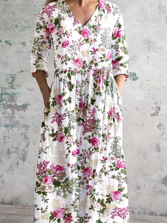 Women's Art Rose Floral V Neck Cotton and Linen Dress With Pockets