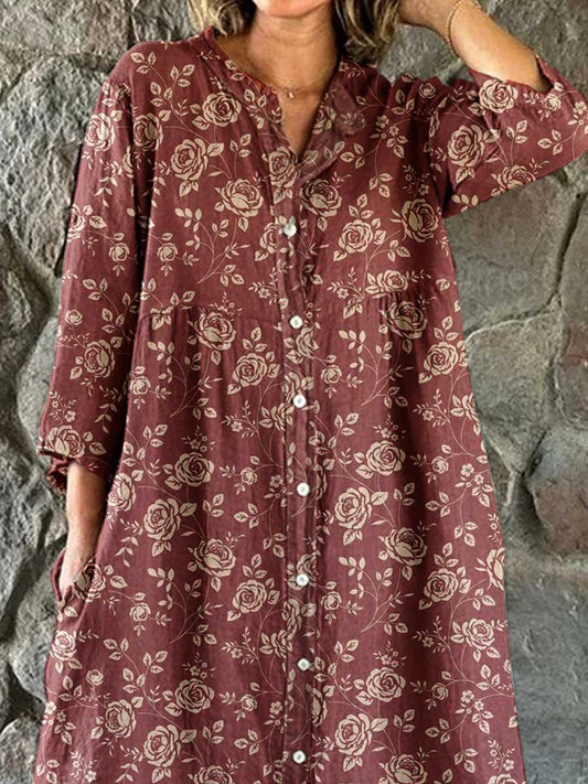 Women's Elegant Floral Pattern Shirt Style Cotton and Linen Dress