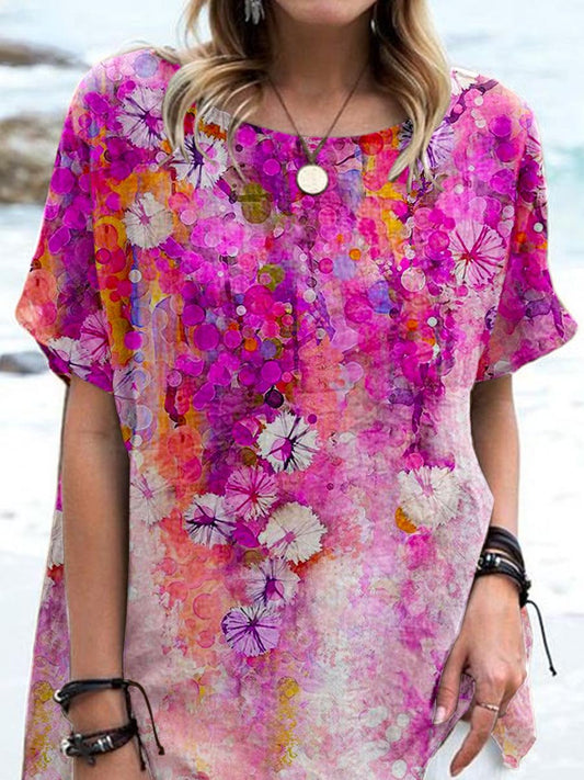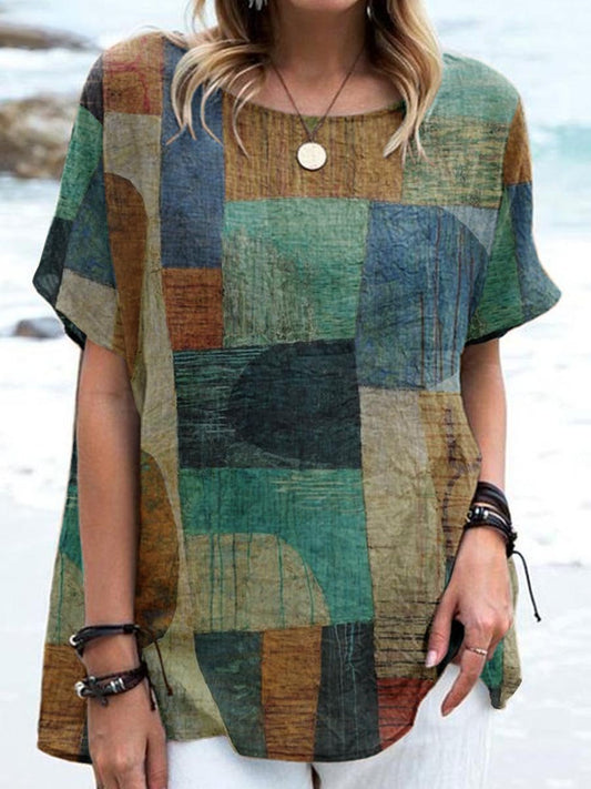 Women's Artistic Color Pattern Printed Cotton And Linen Top