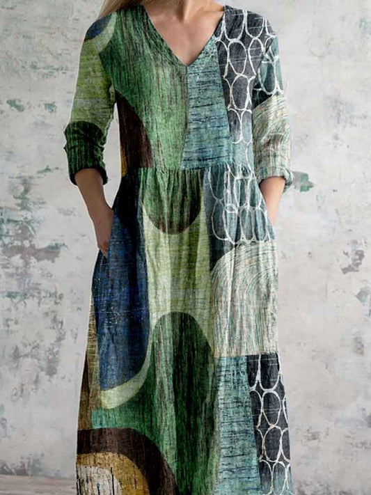 Women's Art Geometric Textured V-Neck Cotton and Linen Dress with Pockets
