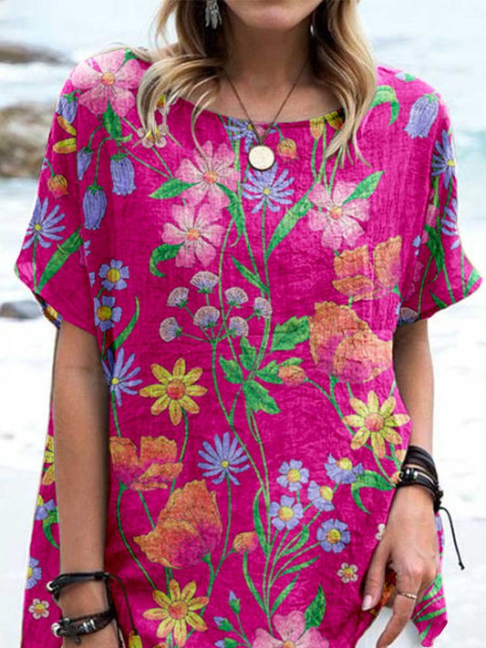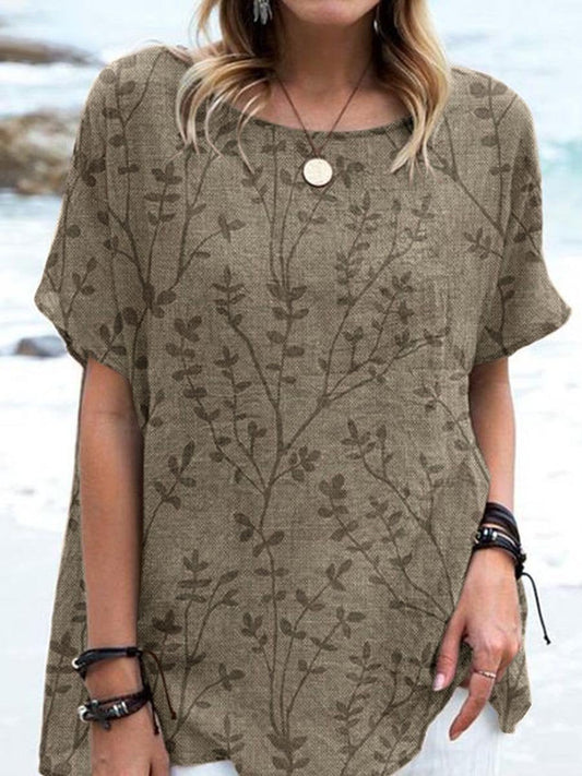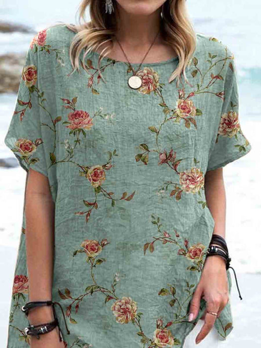 Women's Elegant Floral Print Cotton and Linen Top
