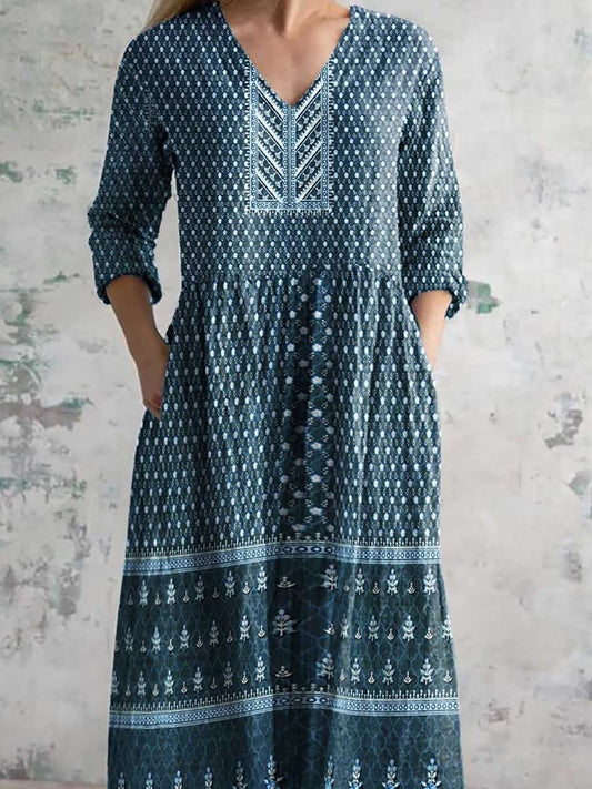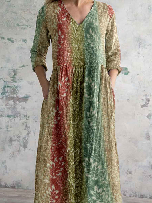 Women's Elegant Boho Geometric Pattern Color Gradient Print V-Neck Cotton and Linen Dress