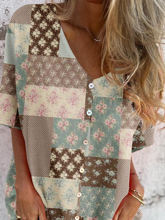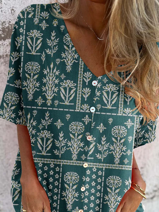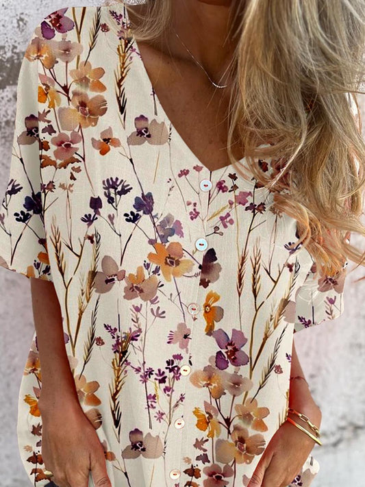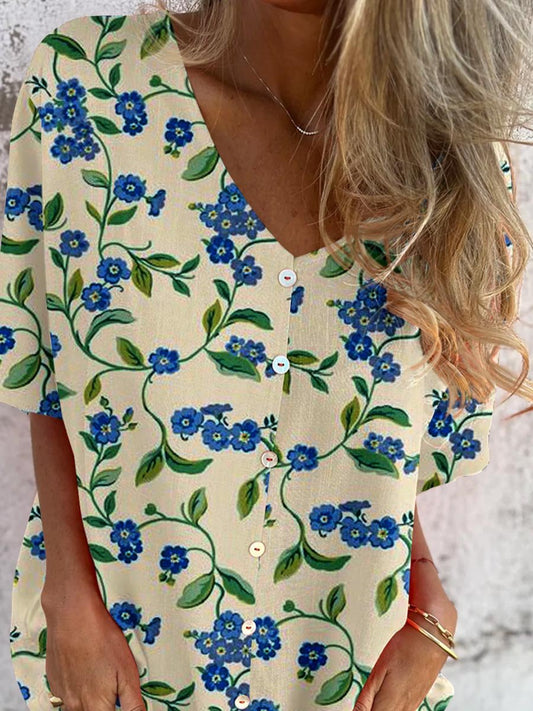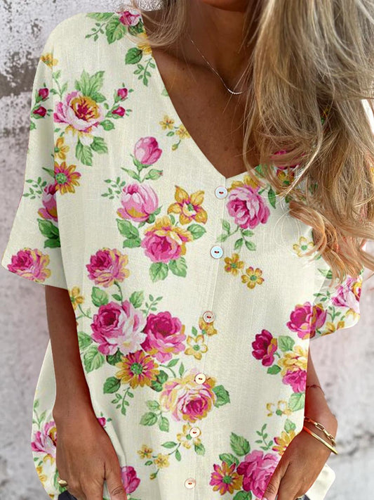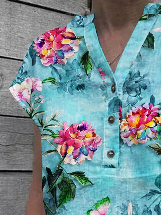 Women's Elegant Floral Pattern Shirt Style Cotton and Linen Top