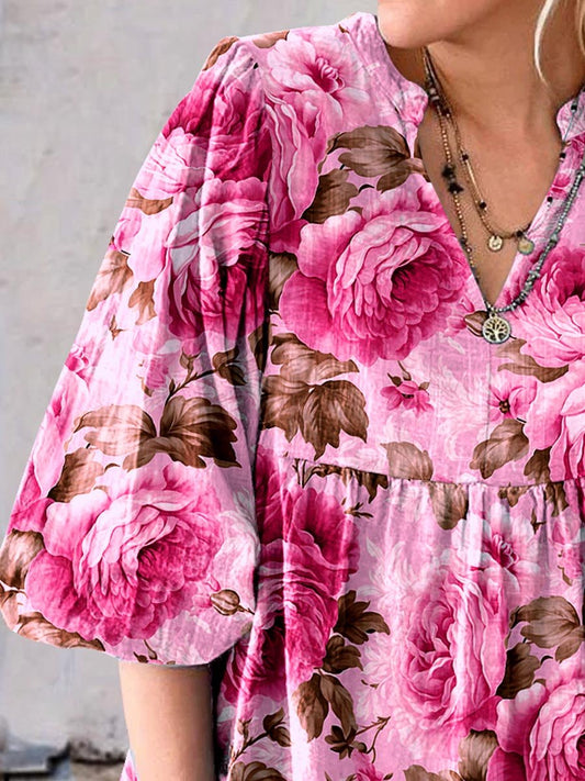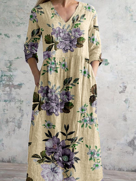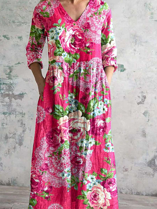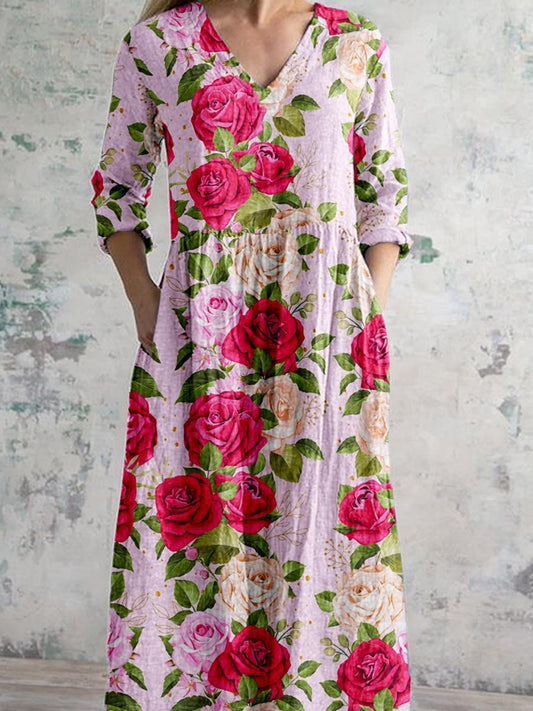 Women's Elegant Rose Floral Pattern V-Neck Cotton and Linen Dress with Pockets