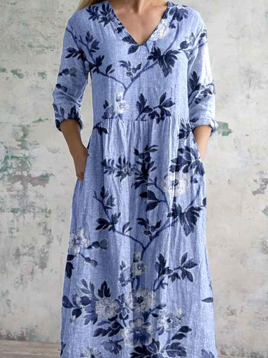 Women's Elegant Retro Geometric Floral V-Neck Cotton and Linen Dress with Pockets