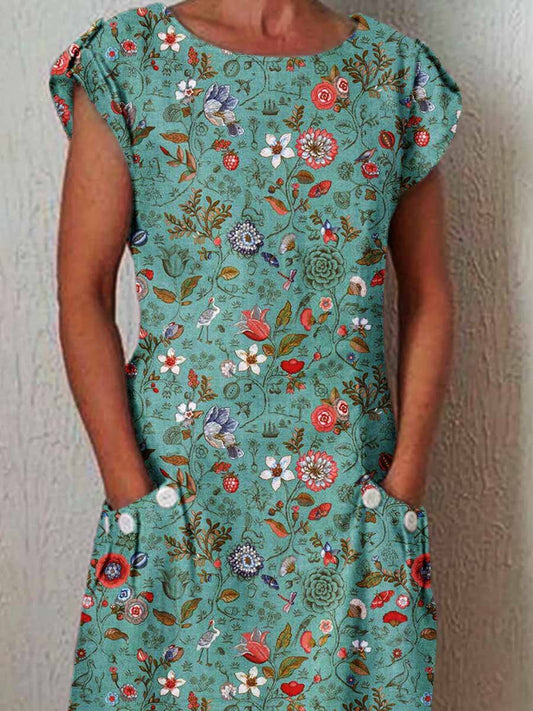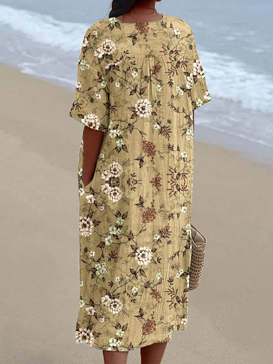 Women's Art Geometric Floral Pattern Cotton and Linen Dress with Pockets