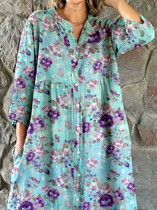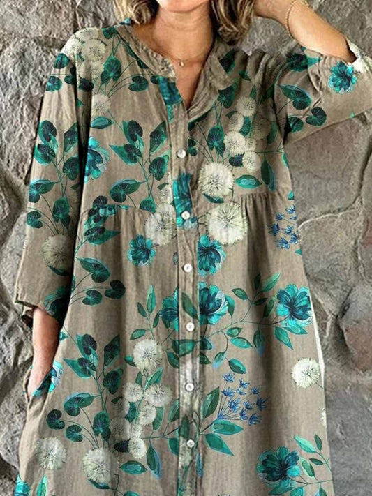 Women's Elegant Floral Pattern Shirt Style Cotton and Linen Dress