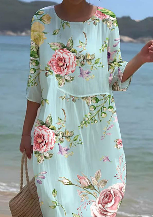 Women's Resort Style Flower Pattern Cotton and Linen V-Neck Dress