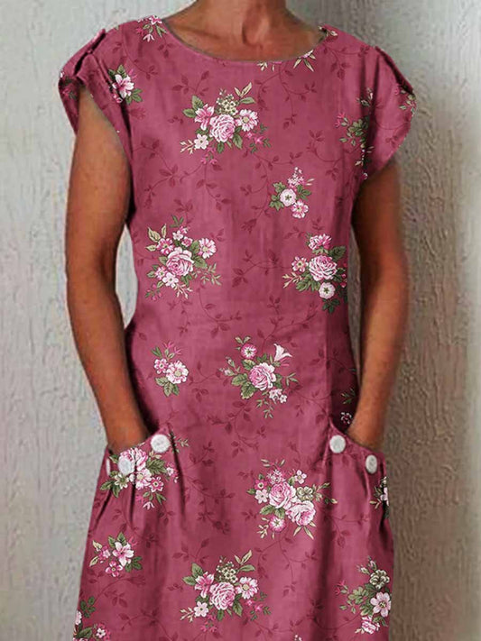 Women's Elegant Rose Rose Floral Pattern Cotton and Linen Dress with Pockets