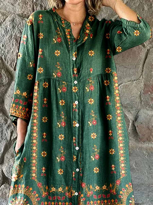 Women's Boho Geometric Elegant Floral Shirt Style Cotton and Linen Dress