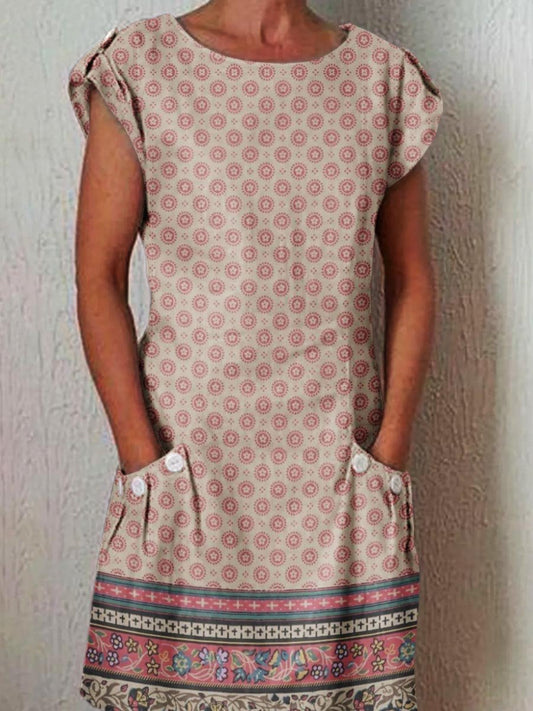 Women's Round Neck Vintage Geometric Print Pattern Dress with Pockets