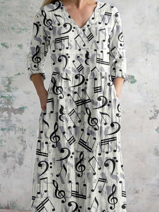 Women's Elegant Art Note Pattern Cotton and Linen Dress with Pockets