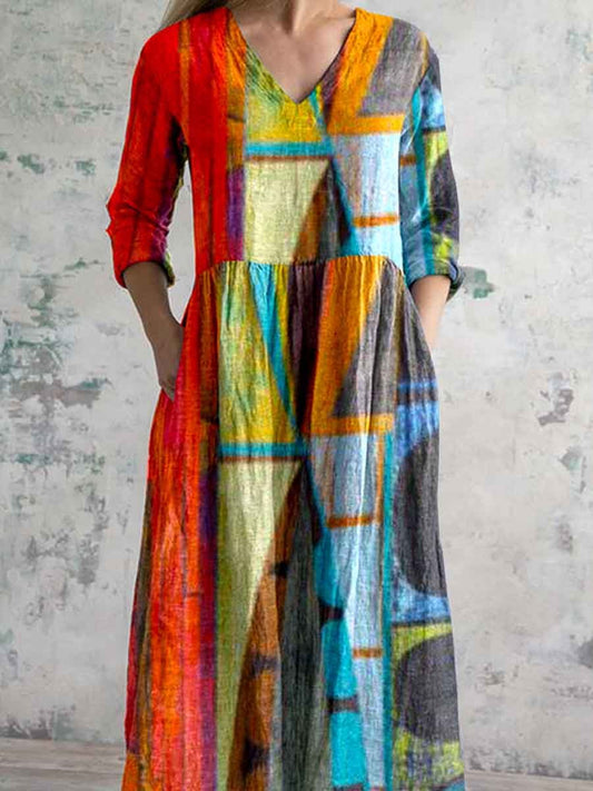 Women's Artistic Texture Geometric Pattern V-neck Cotton And Linen Dress