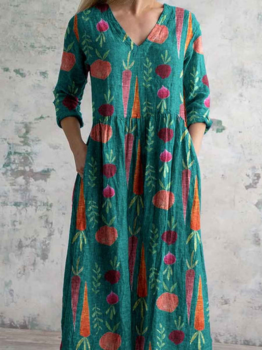 Women's Elegant Vegetable Carrot Pattern V-Neck Cotton and Linen Dress