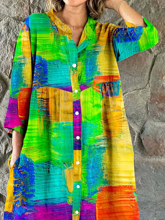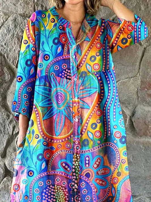 Robe chemise en coton et lin à motifs géométriques bohèmes artistiques pour femme