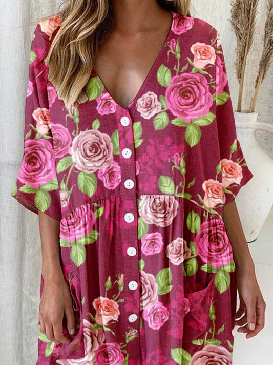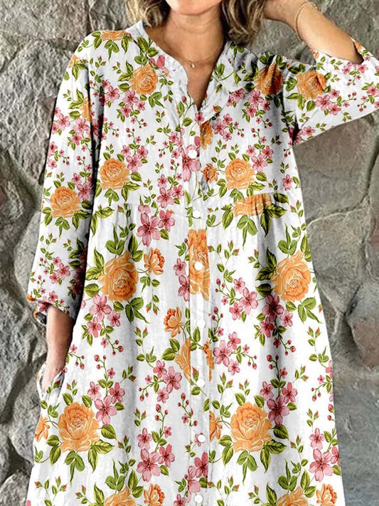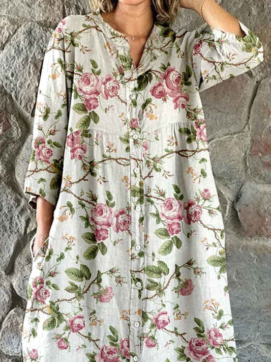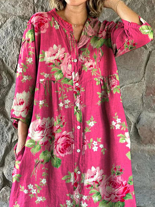 Robe chemise simple et élégante en coton et lin à imprimé de fleurs de rose pour femme