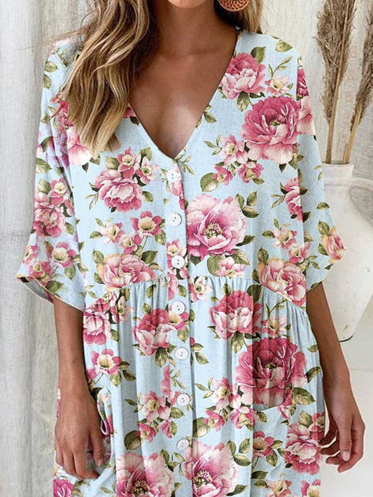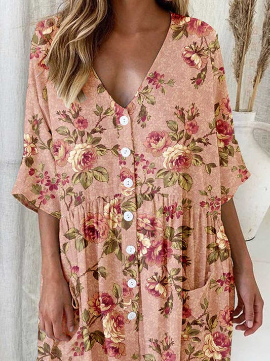 Robe cardigan élégante à col en V et motif floral rose en coton et lin pour femme