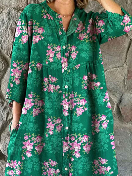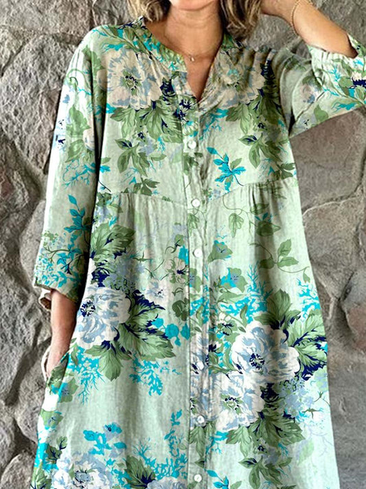 Robe chemise en coton et lin à motif floral simple et élégant pour femme