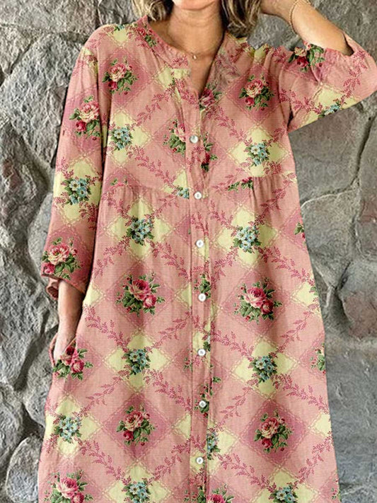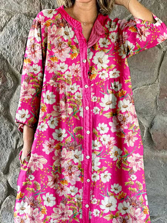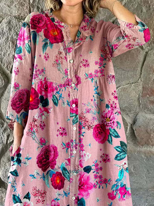 Robe chemise simple et élégante en coton et lin à imprimé floral rose pour femme