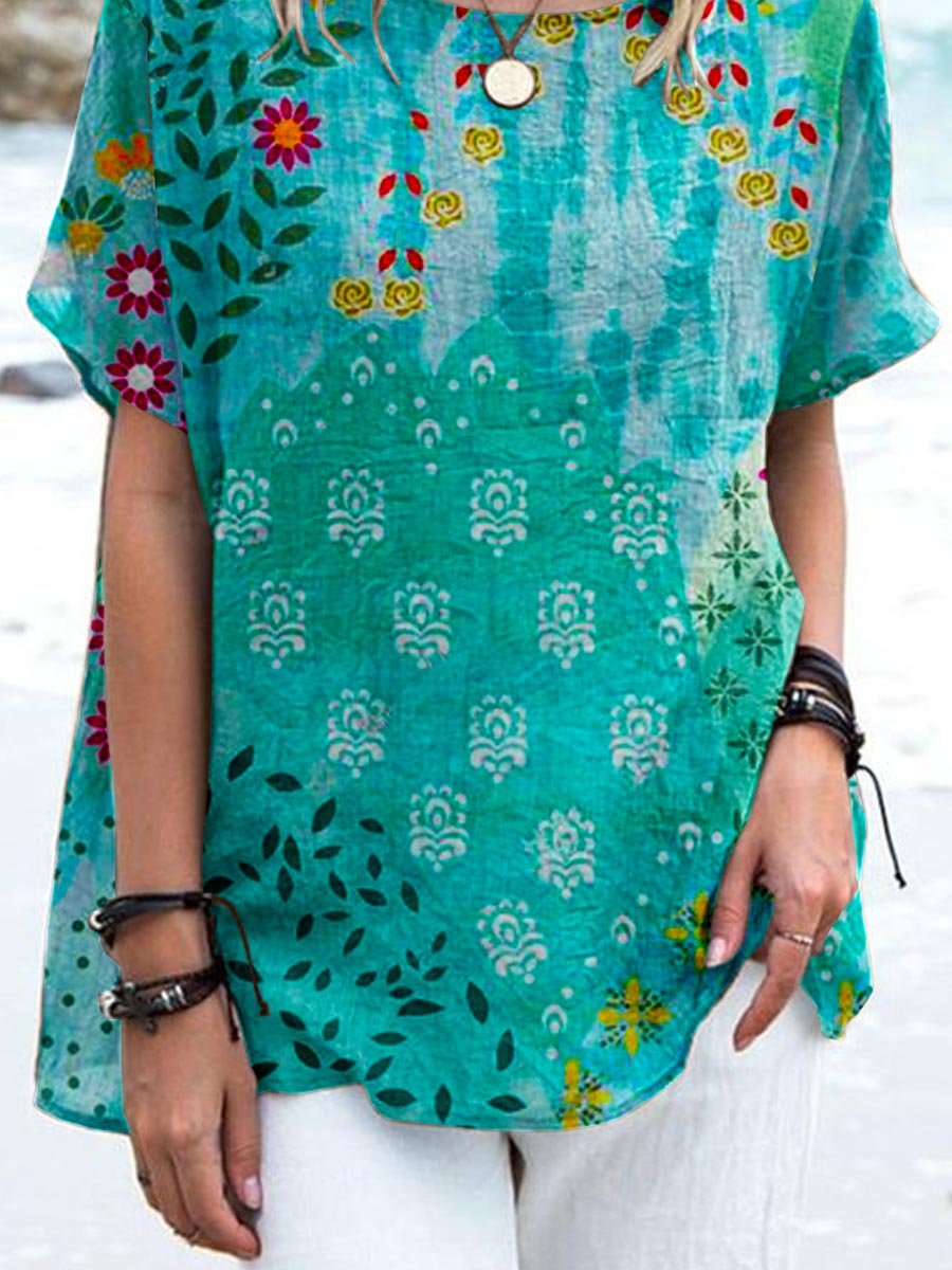 Haut élégant en coton et lin à imprimé floral pour femme