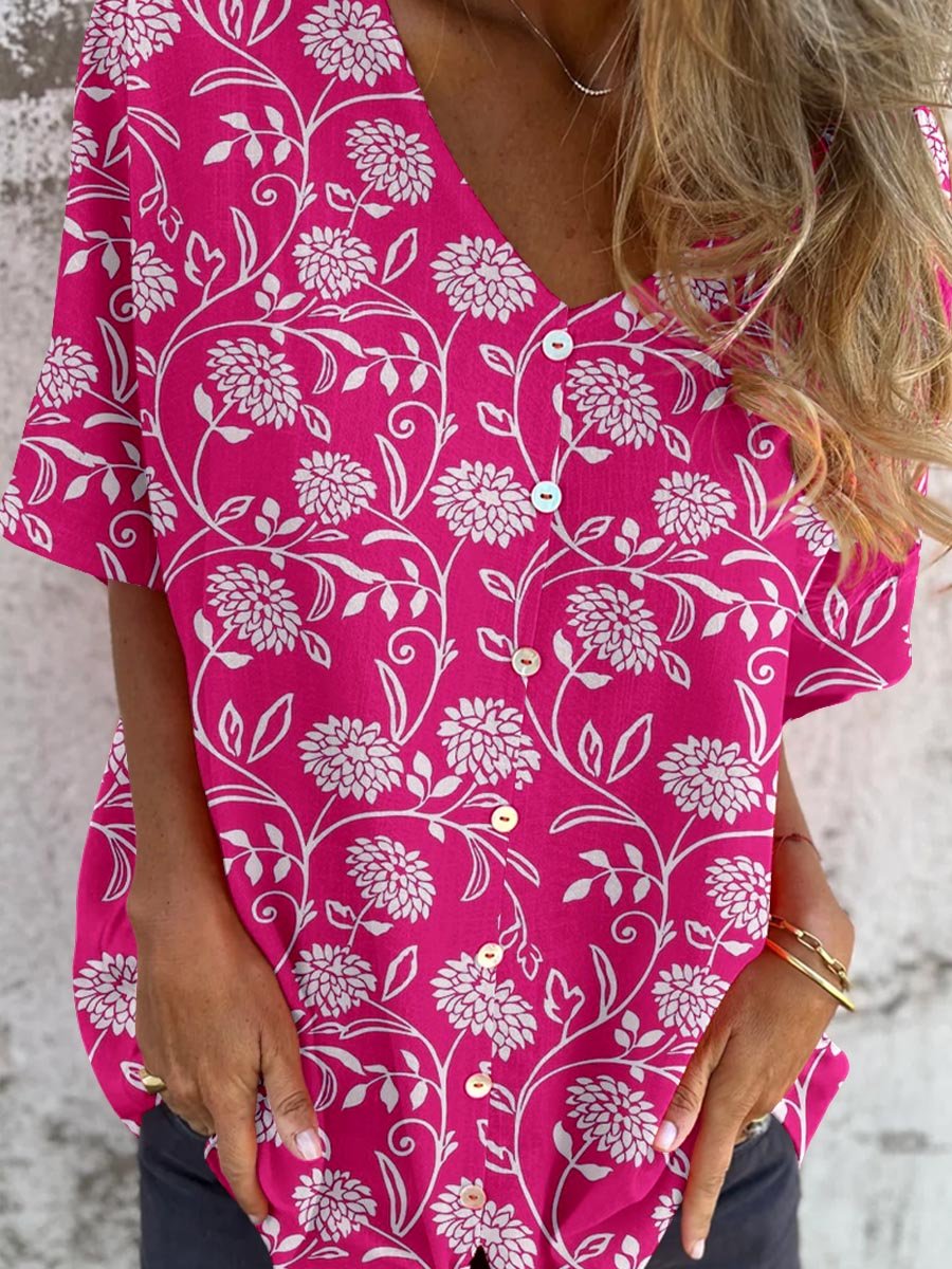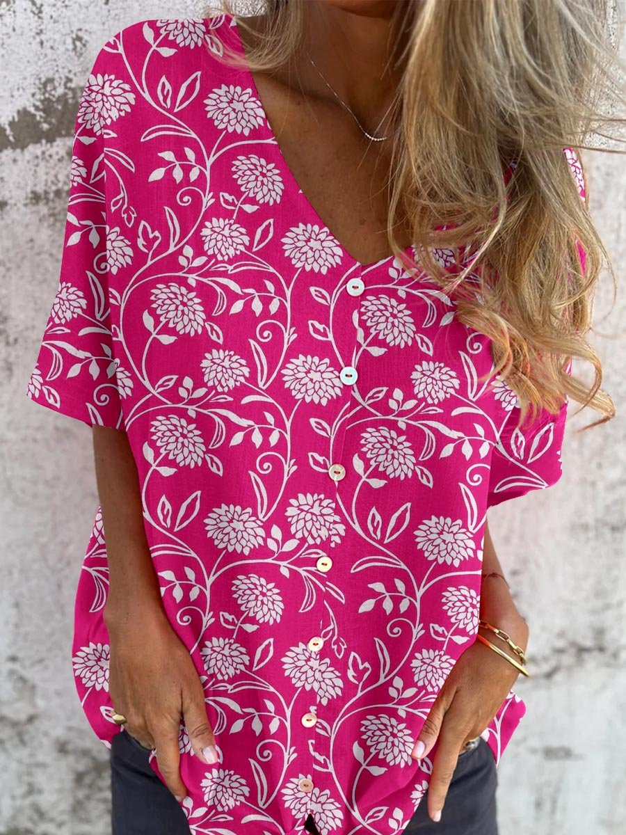 Cardigan élégant à col en V et motif floral simple pour femme en coton et lin