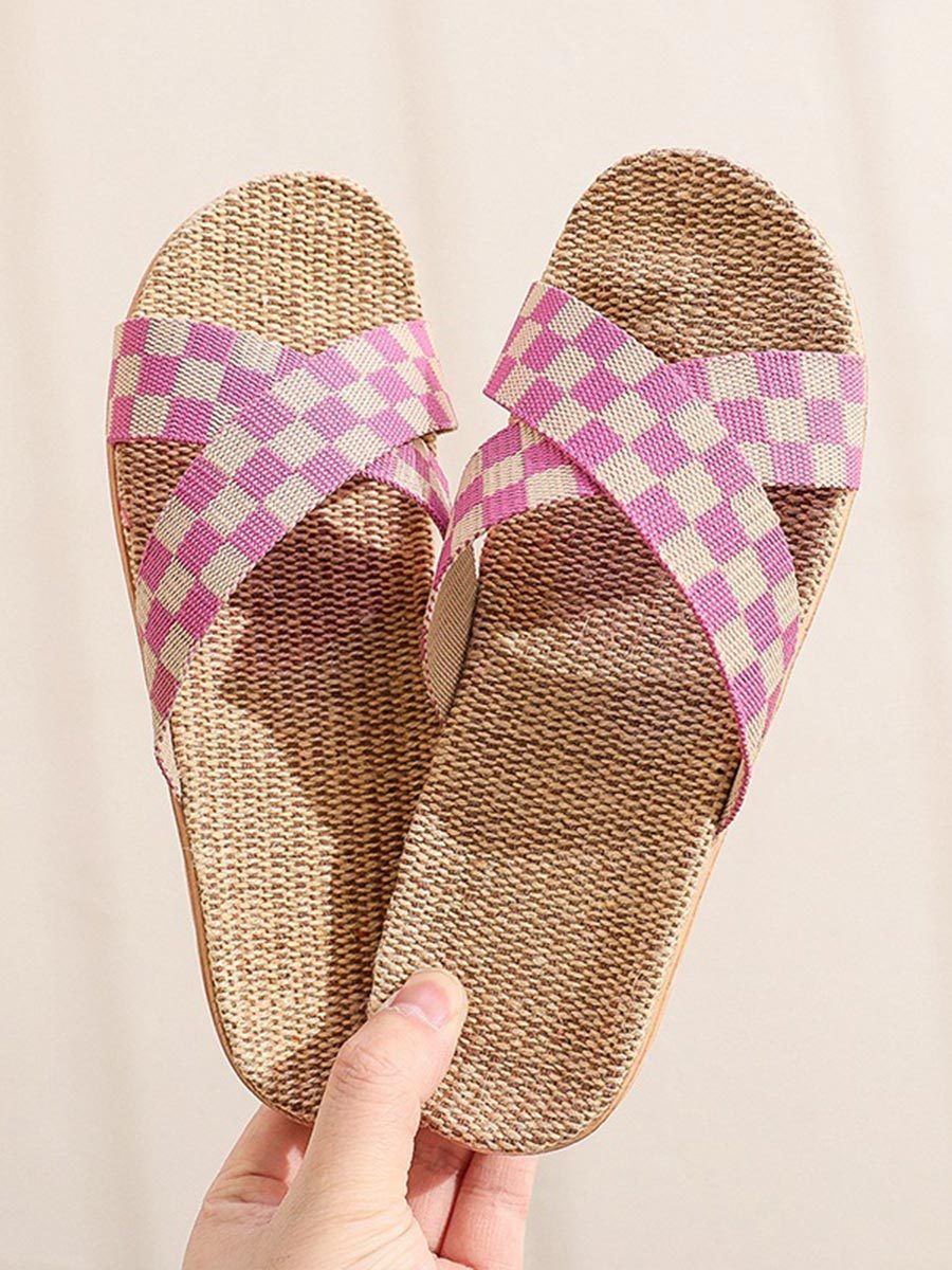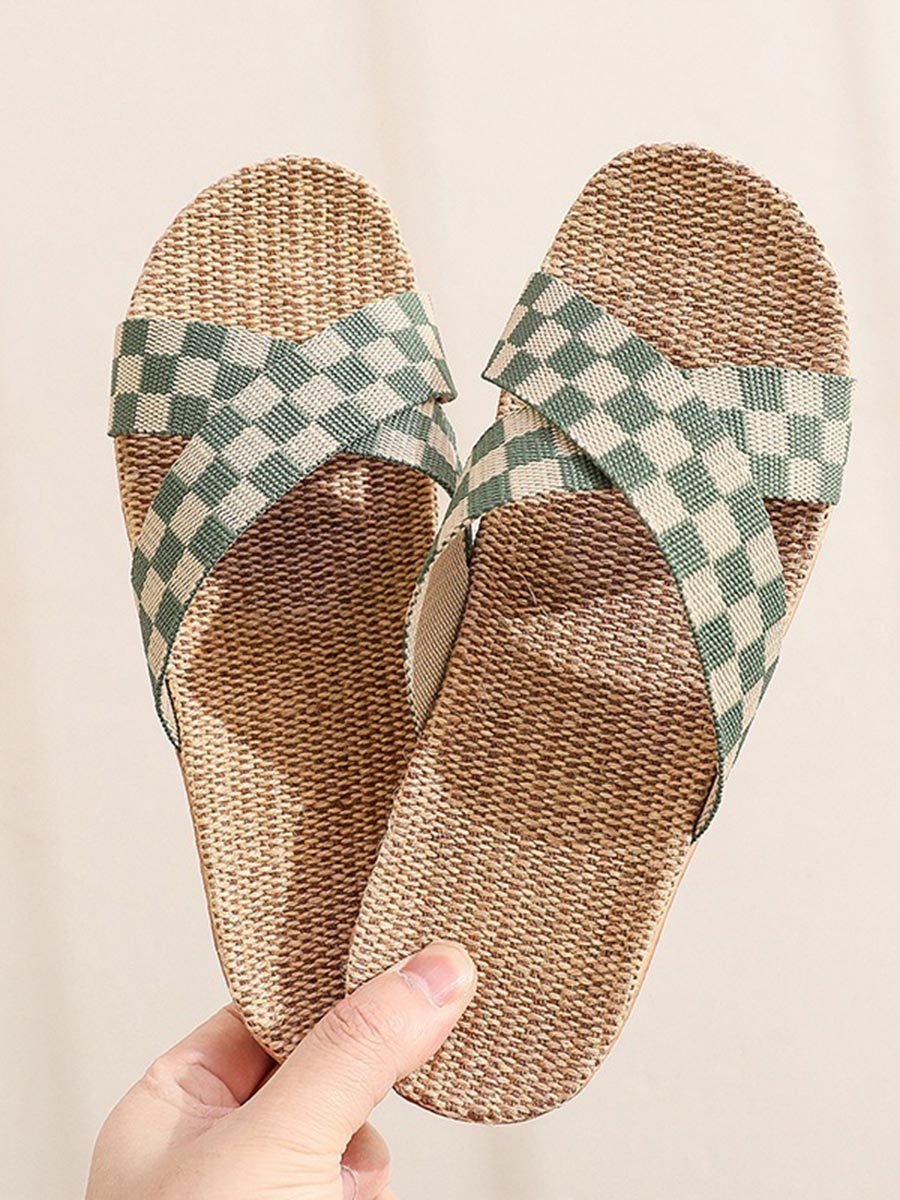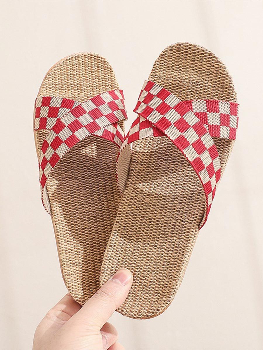 Chaussons d'intérieur antidérapants à semelle épaisse en lin à carreaux pour femmes