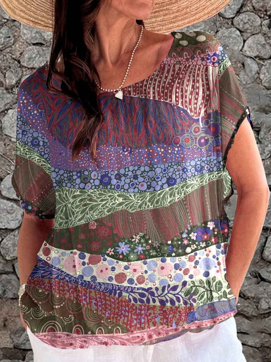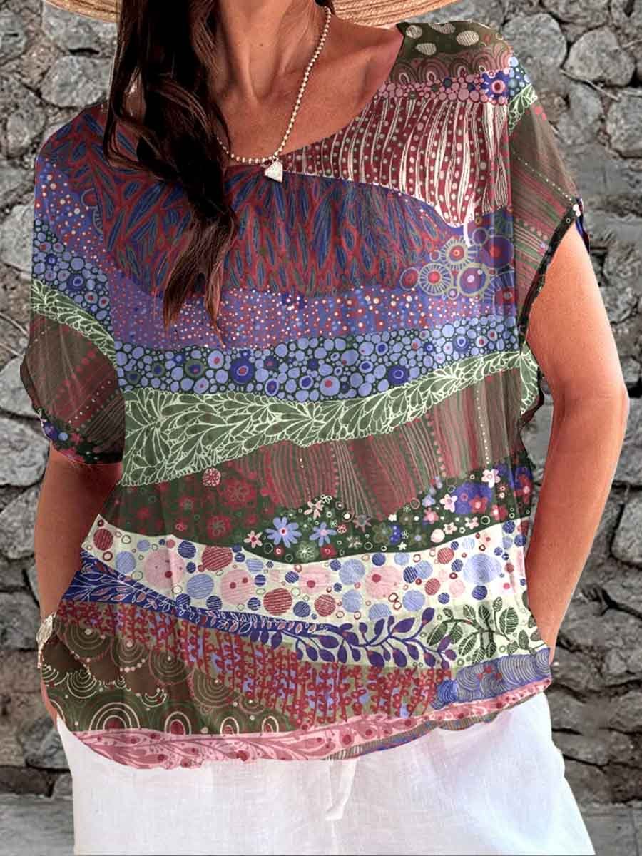 Haut à motif irrégulier à rayures florales pastorales rétro pour femmes
