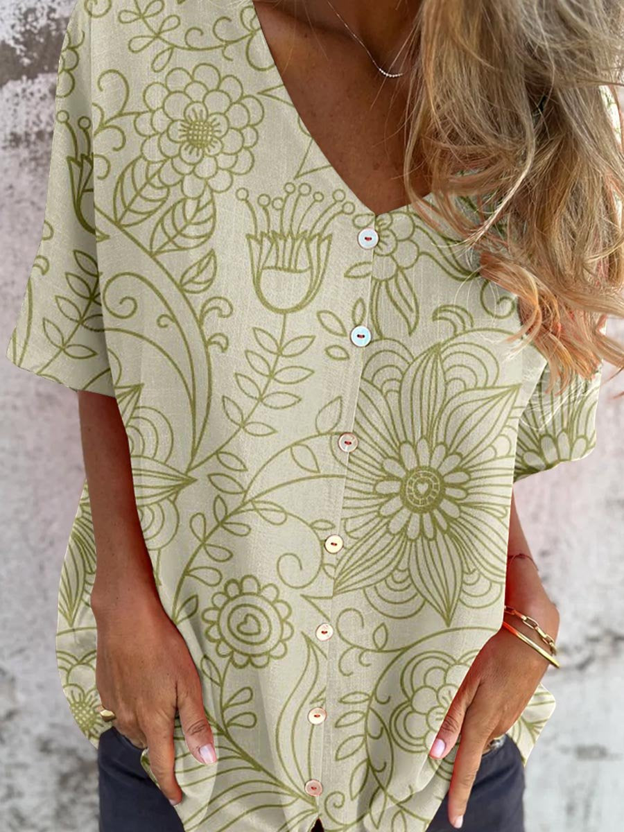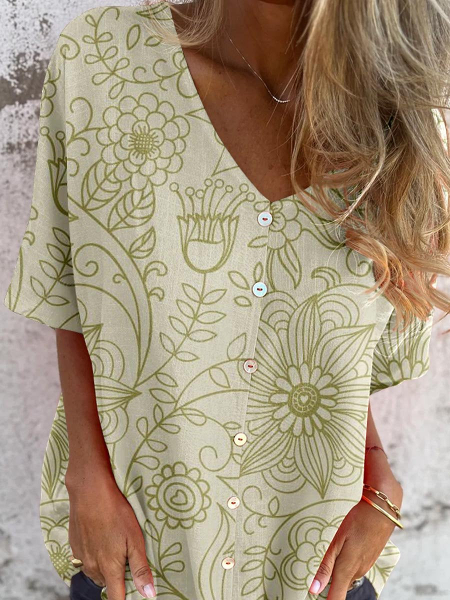 Haut en coton et lin à col en V à motif floral simple pour femme