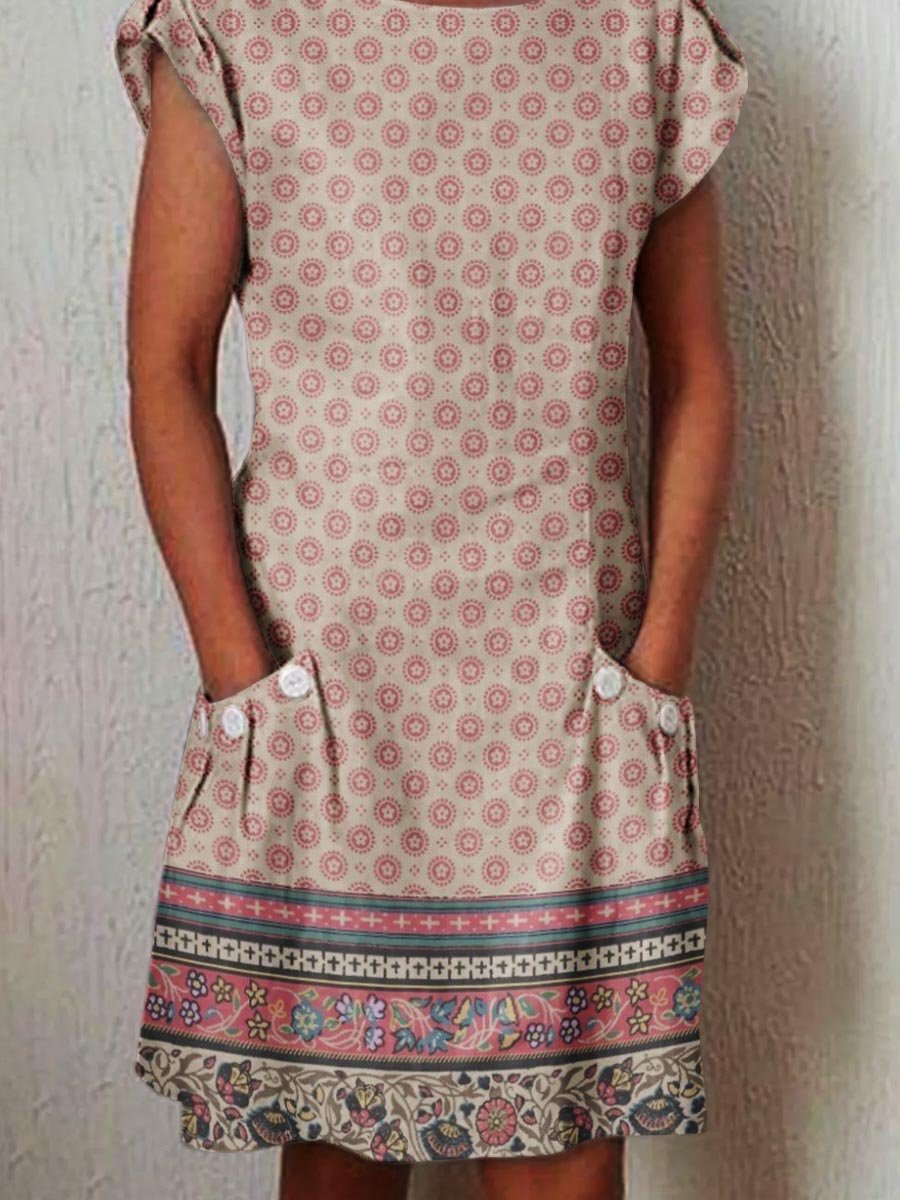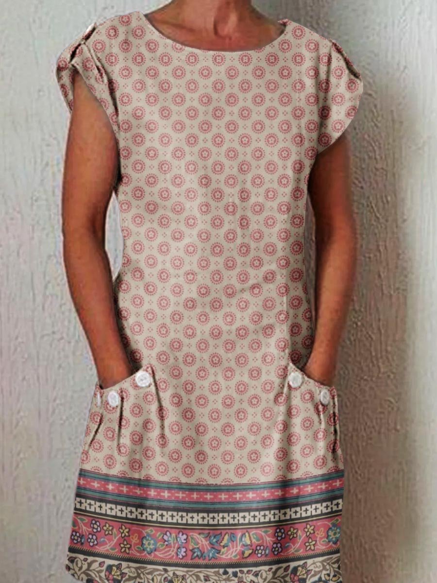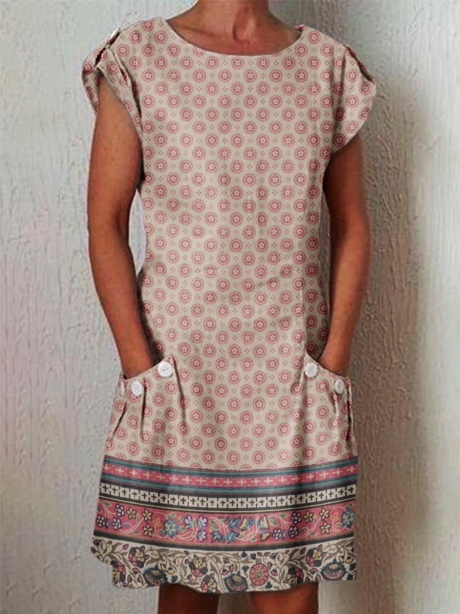 Women's Art Geometric Floral Pattern Cotton and Linen Dress with Pockets