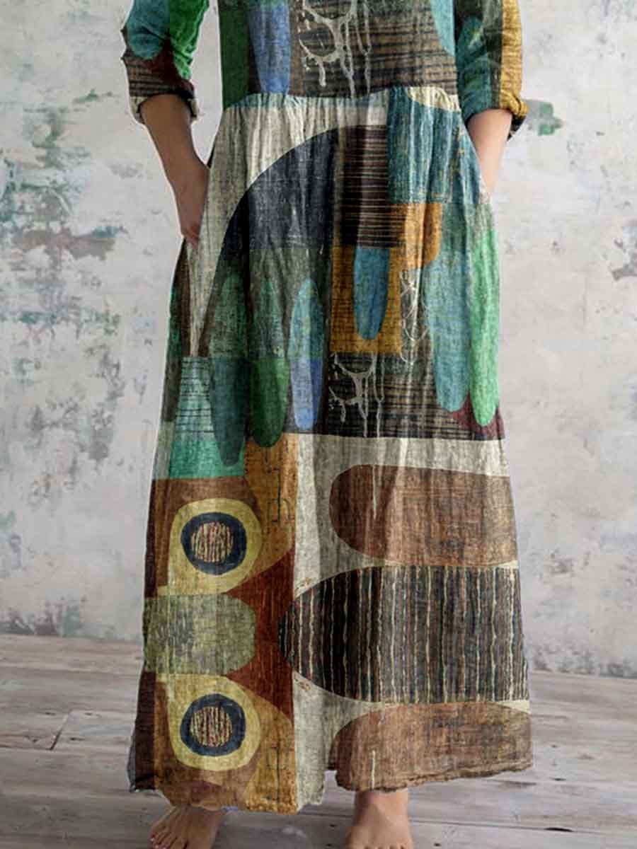 Women's Art Geometric Textured V-Neck Cotton and Linen Dress with Pockets