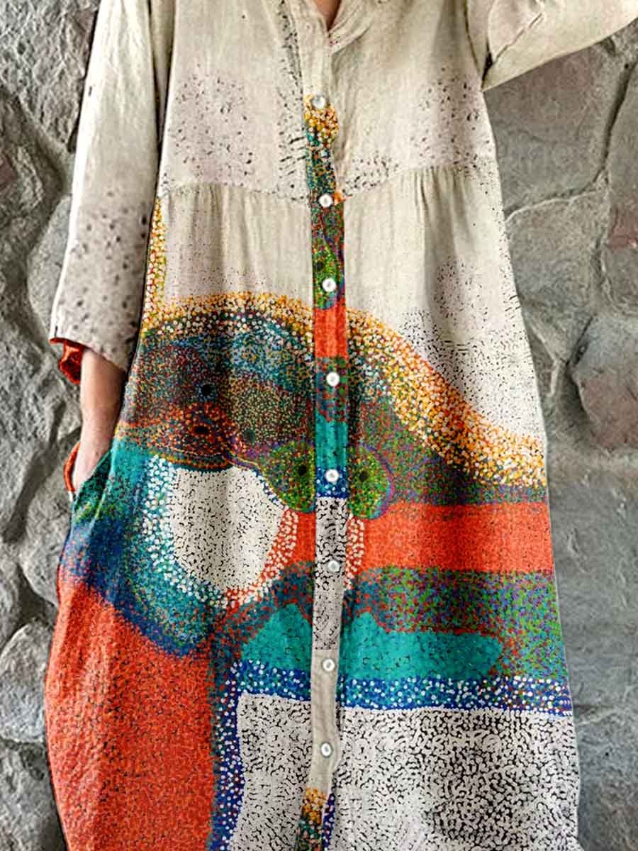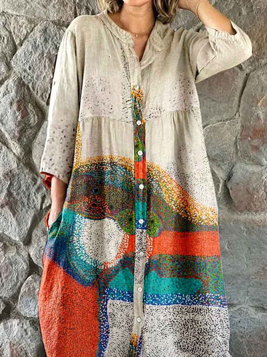 Women's Art Quicksand Pattern Shirt Style Cotton and Linen Dress