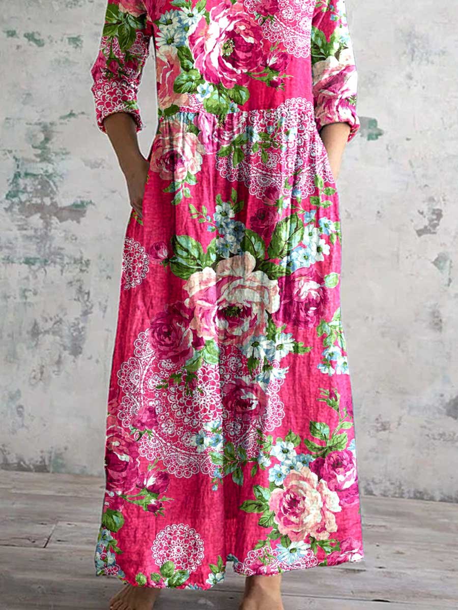 Women's Art Rose Floral V Neck Cotton and Linen Dress With Pockets