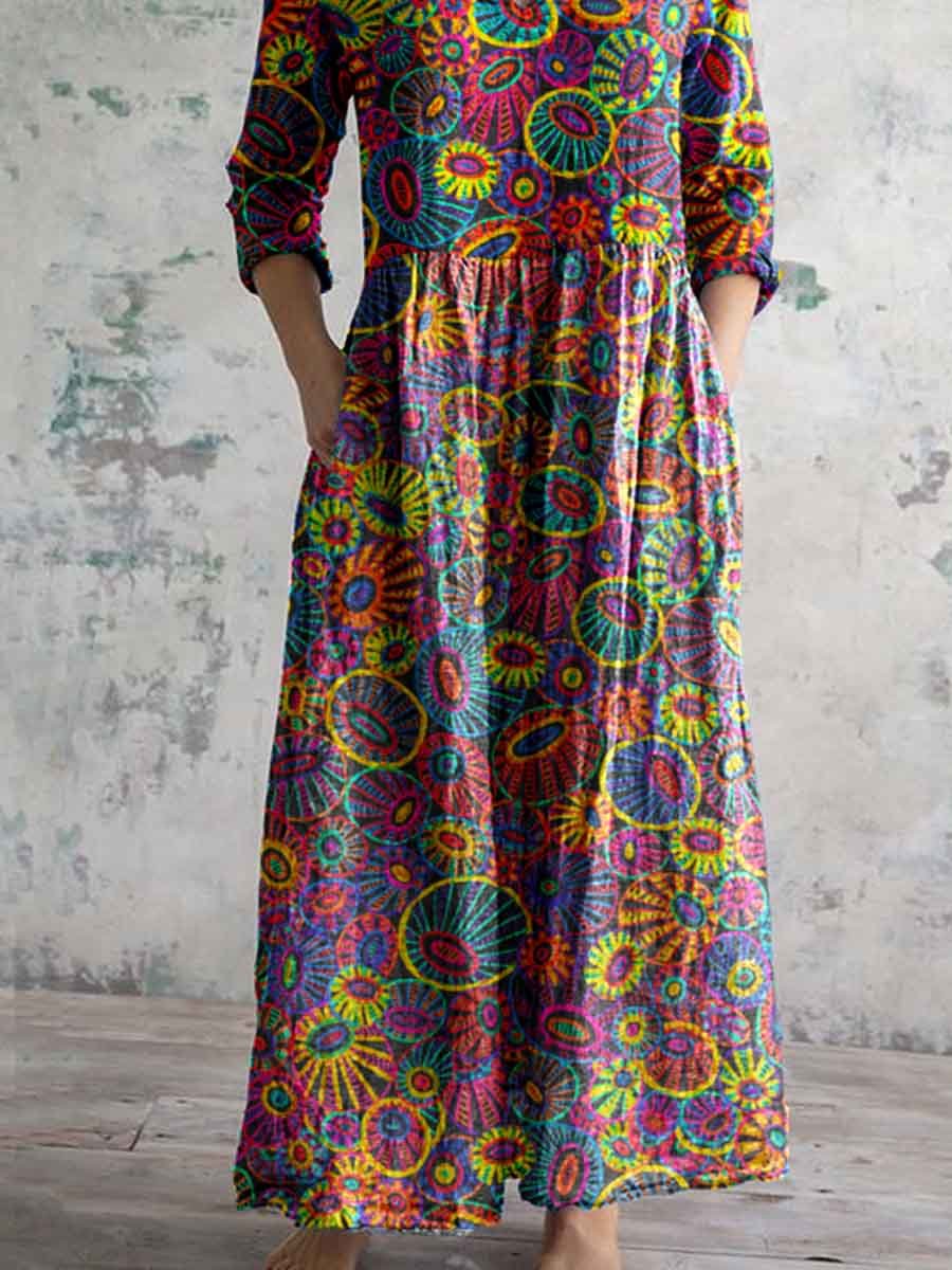 Women's Artistic Texture Geometric Pattern V-neck Cotton And Linen Dress
