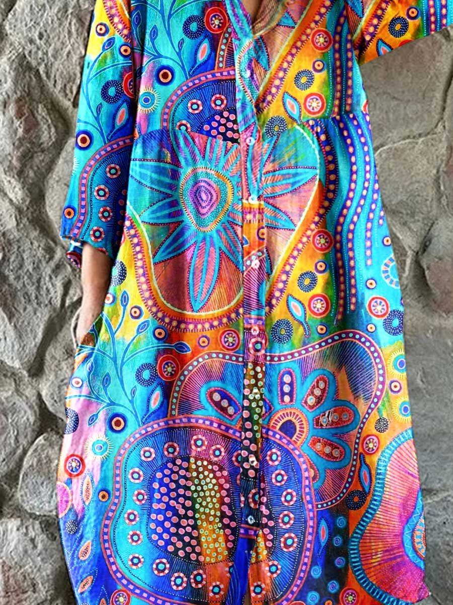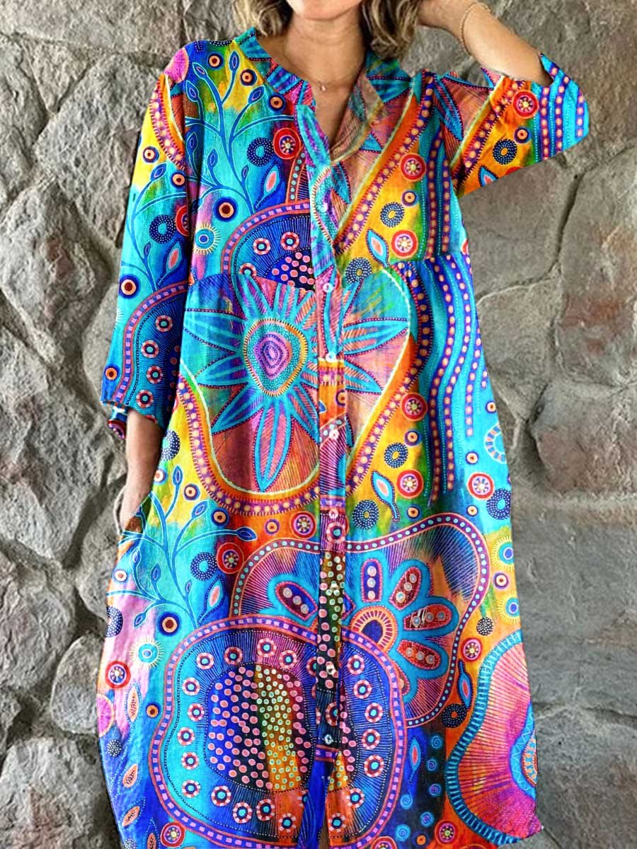 Women's Arty Bohemian Geometric Pattern Cotton and Linen Shirt Dress