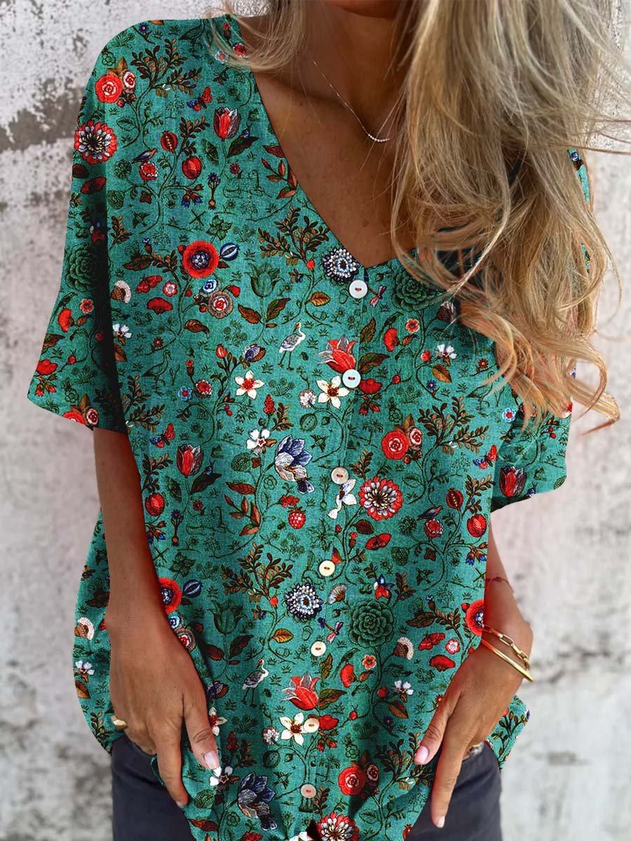 Women's Birds Flora Art Printing Casual Cotton V-neck Top