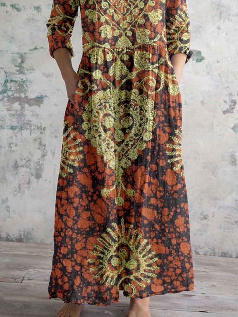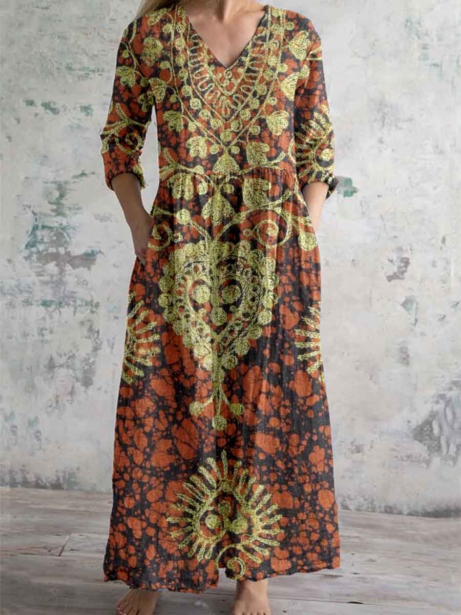Women's Bohemian Pattern V-Neck Cotton and Linen Dress